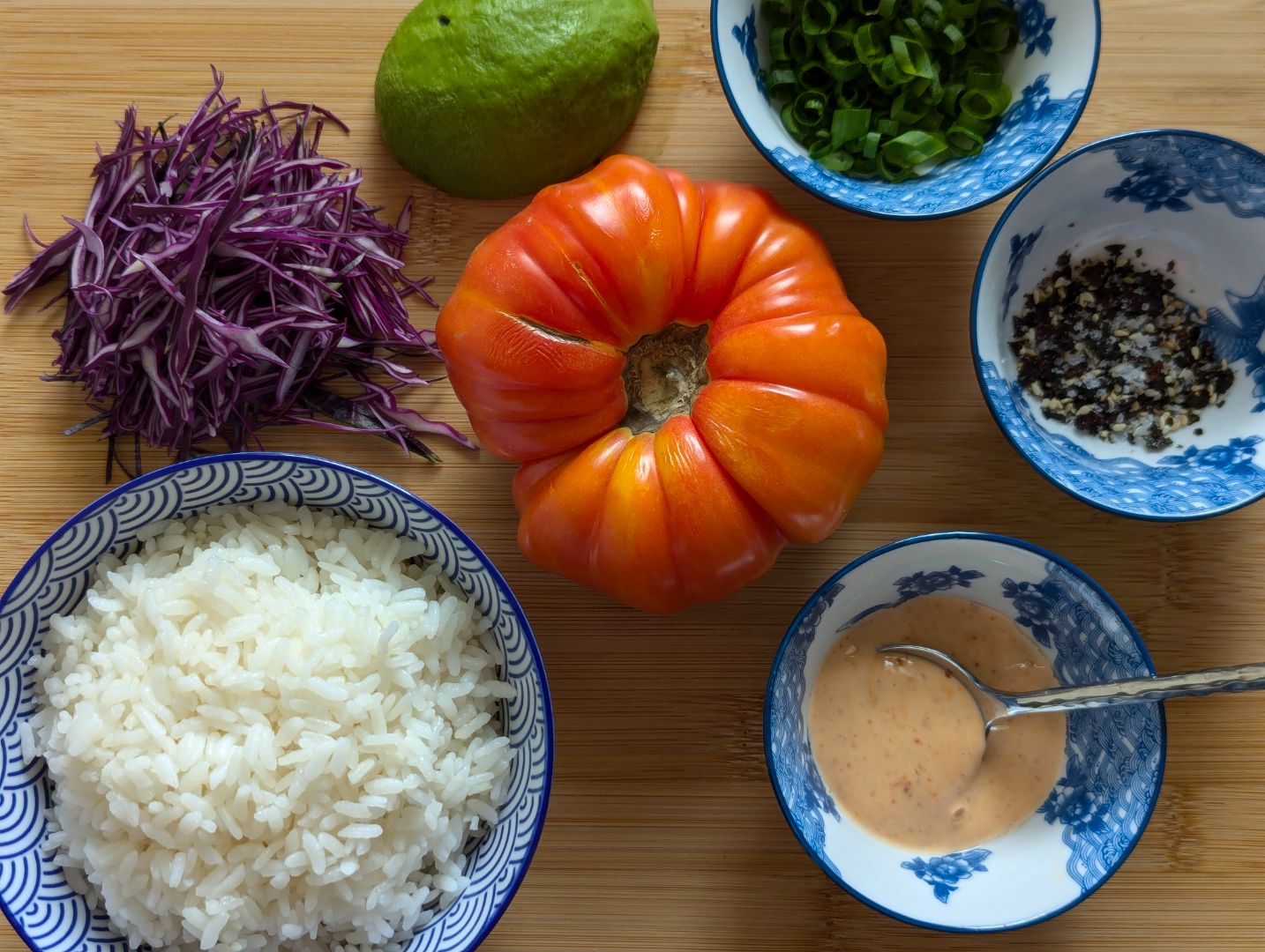 Top with 1 tomato slice, and half of the green onions, red cabbage, and avocado, much like making a sandwich.